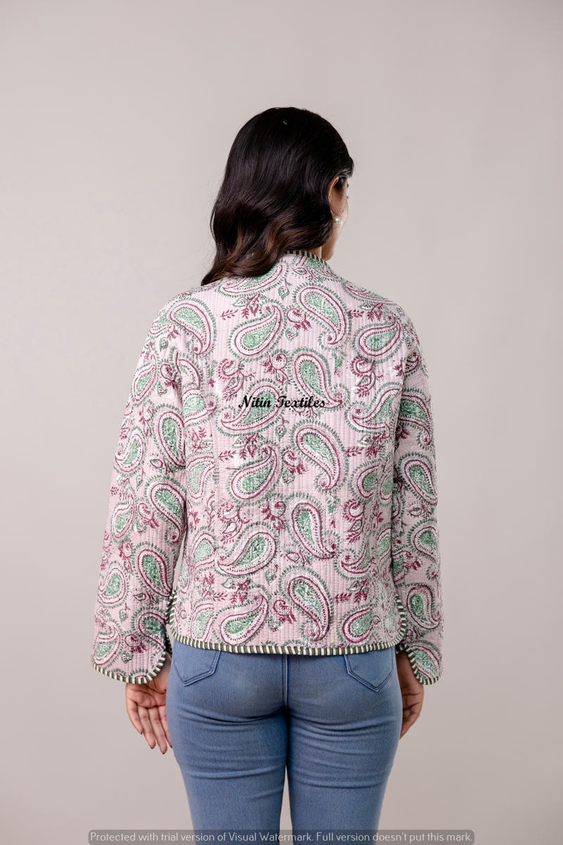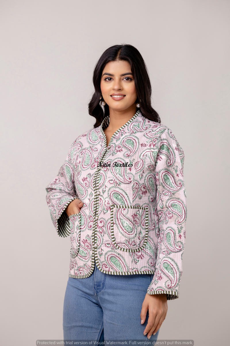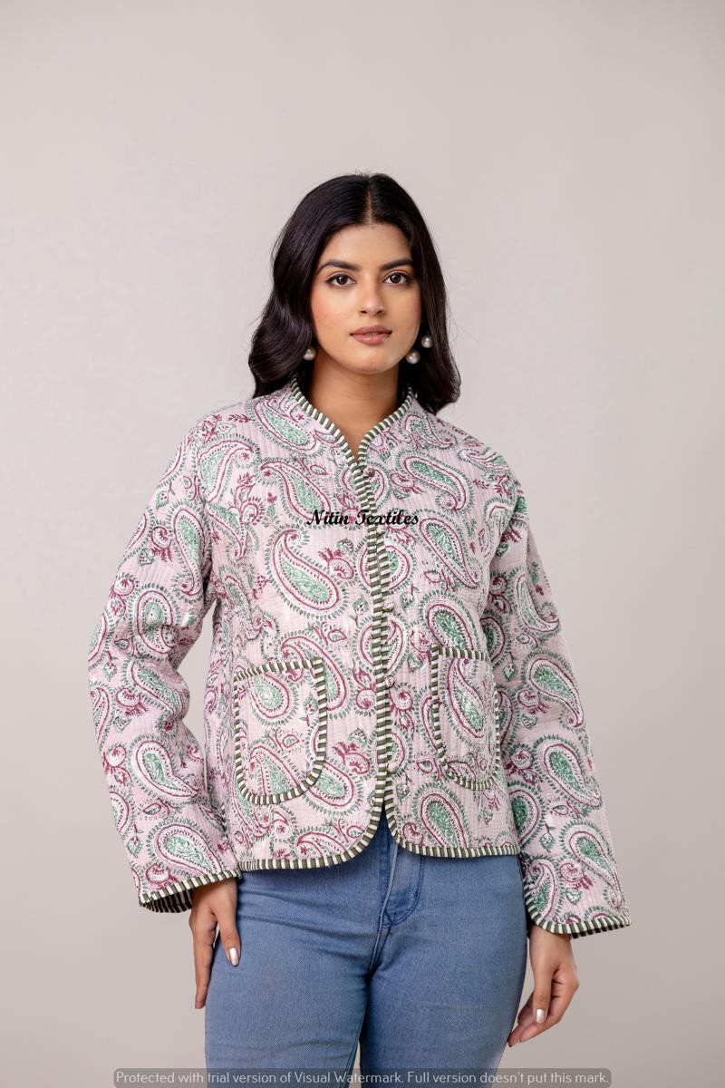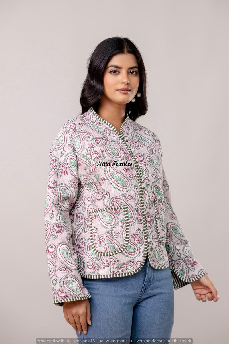 Pink Block Printed Quilted Floral Jacket – Handcrafted Elegance