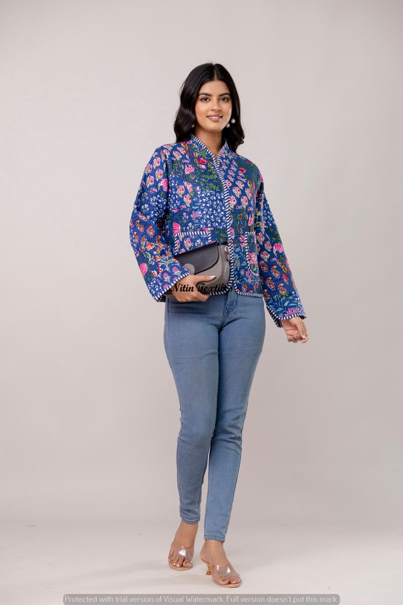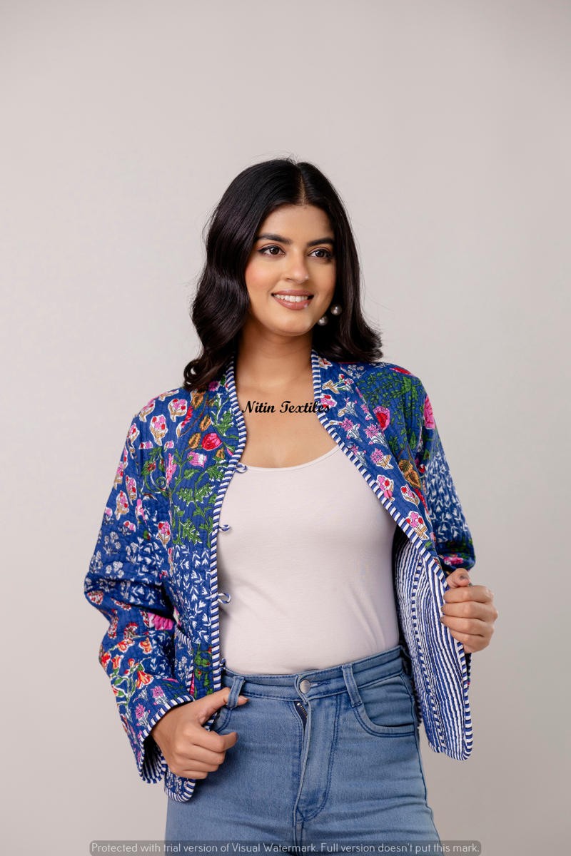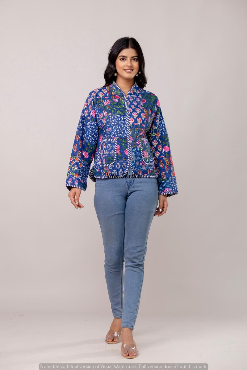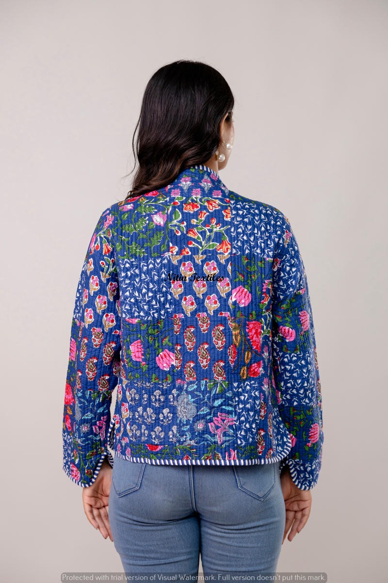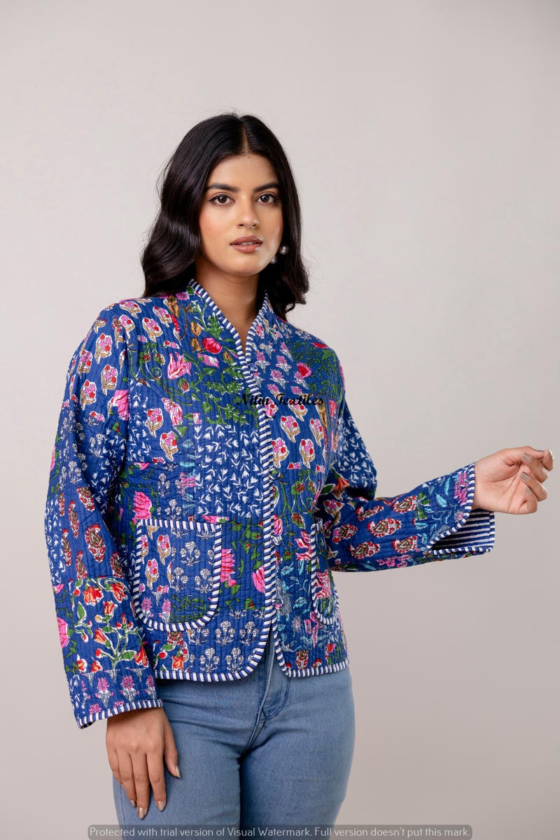 Wrap yourself in elegance with this stunning royal blue quilted jacket from Nitin Textiles. Handcrafted with intricate floral patterns in vibrant pinks and oranges, this full-sleeve waistcoat-style jacket is the perfect blend of comfort and statement-making design. The detailed contrast piping and front patch pockets add a touch of traditional charm, making it ideal for festive layering or a stylish casual look.