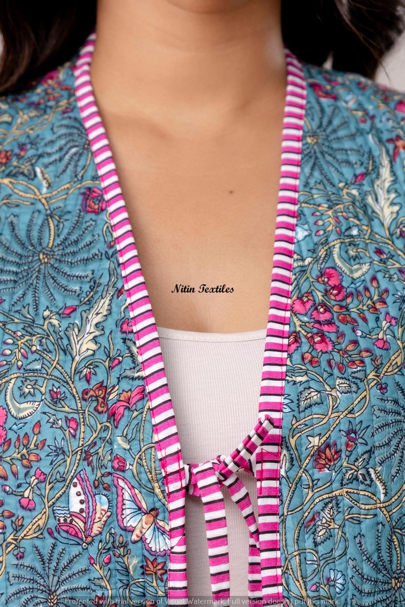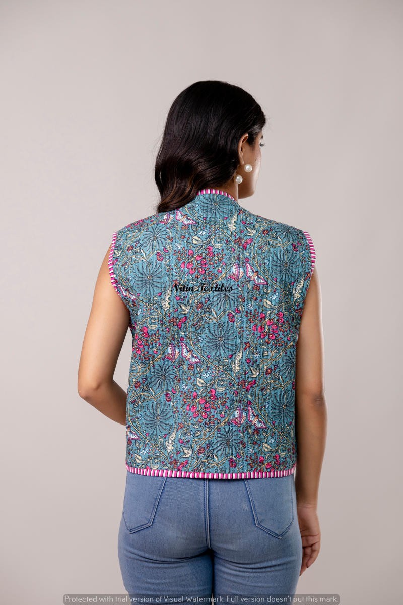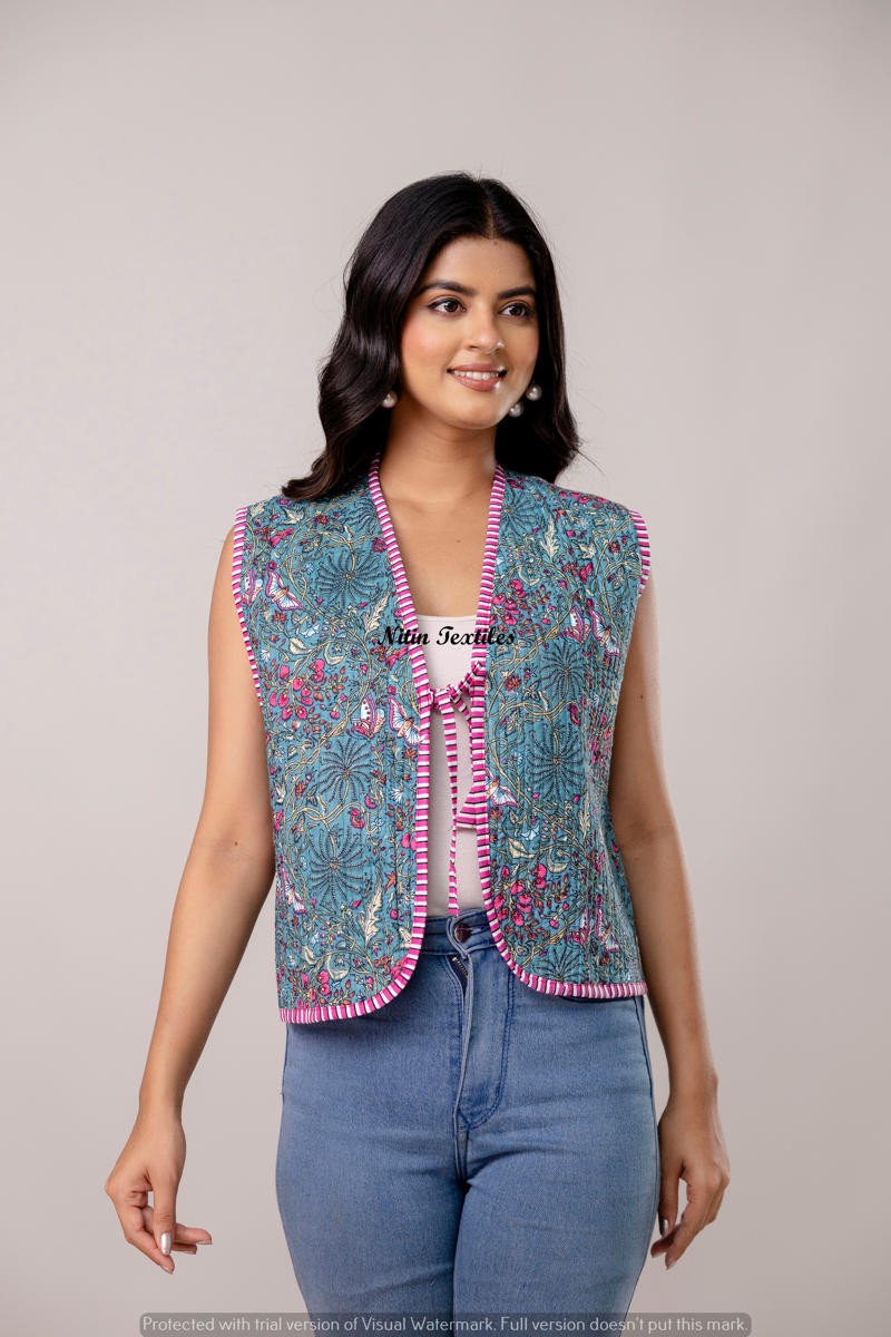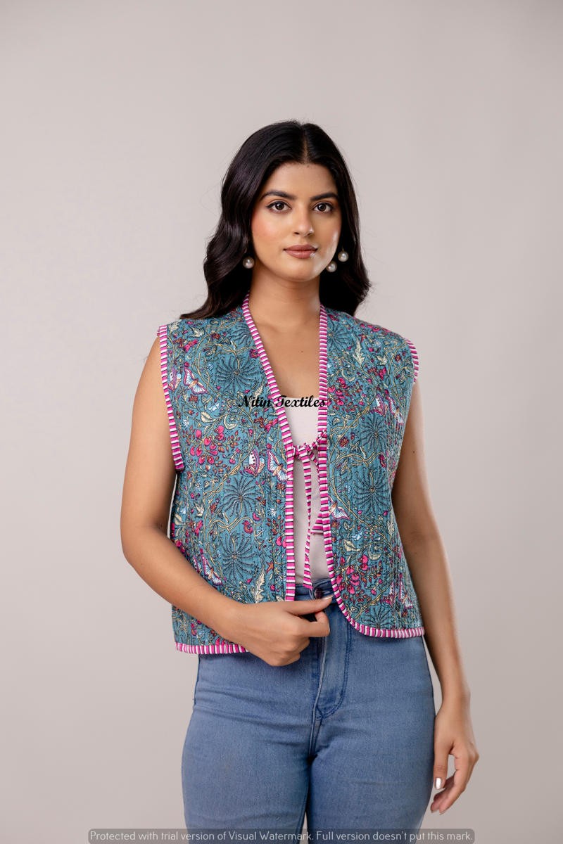Floral Handblock Cotton Waistcoat – Aqua shine