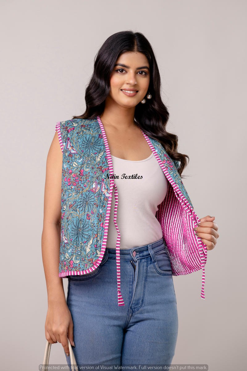 Add a charming touch to your everyday look with this handcrafted cotton waistcoat from Nitin Textiles. Featuring a delightful pink base adorned with floral handblock prints and striped piping detail, this sleeveless jacket blends ethnic elegance with modern style. Lightweight and breathable, it’s perfect for layering over a basic tee, kurti, or crop top for a relaxed yet refined look.