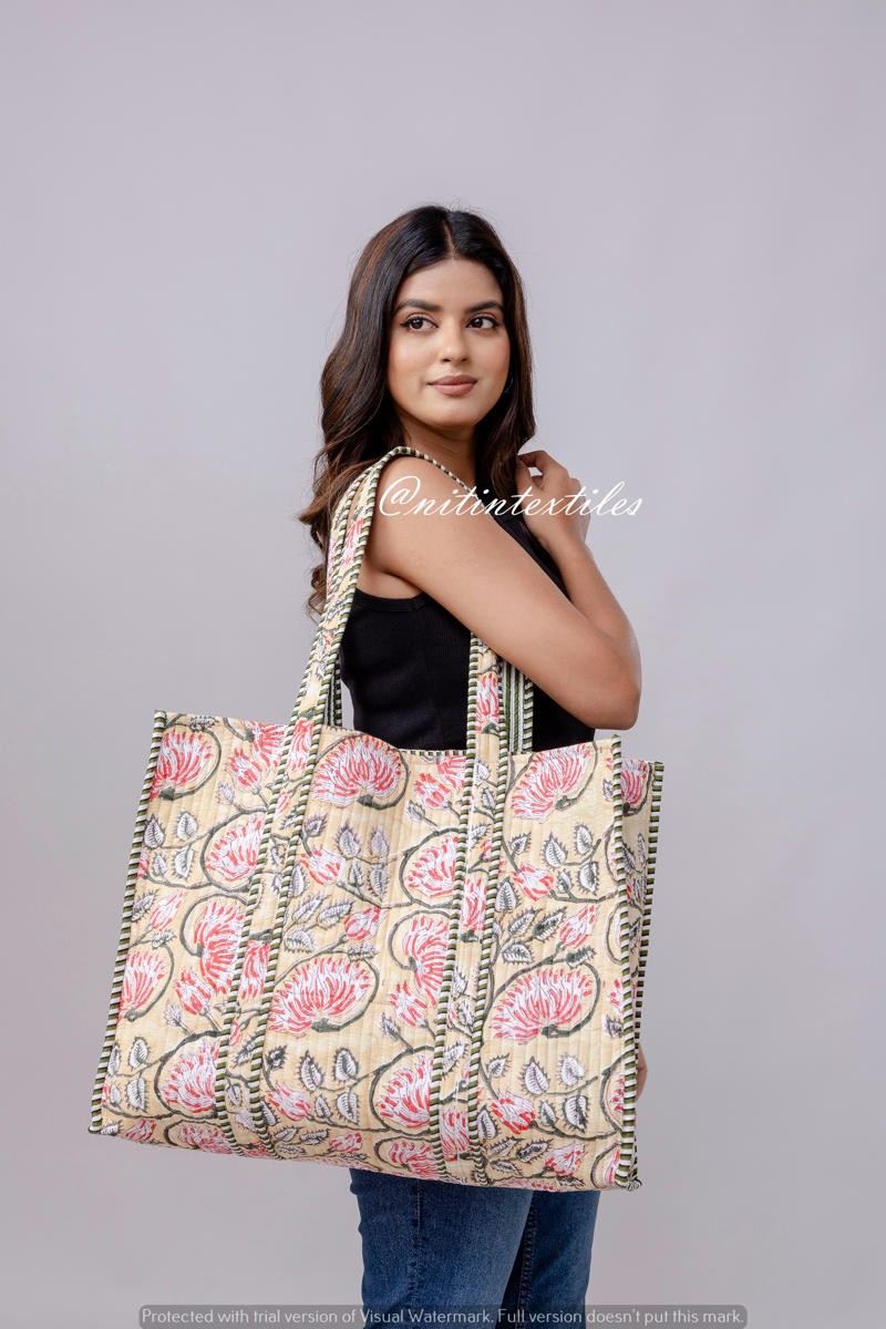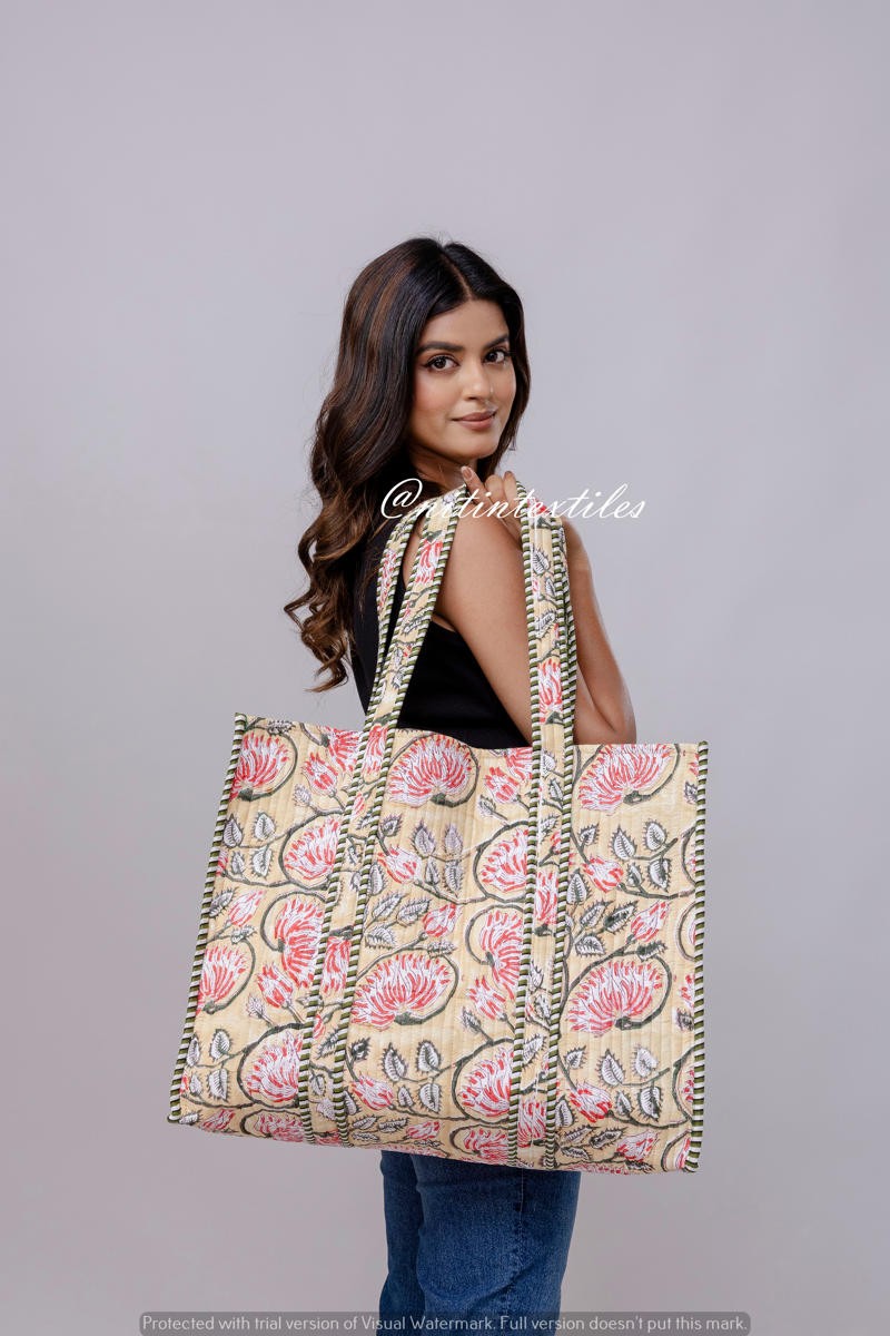 Handmade Cotton Block Printed Reversible Open front Shoulder Handled Tote Bag in Quilted Pattern