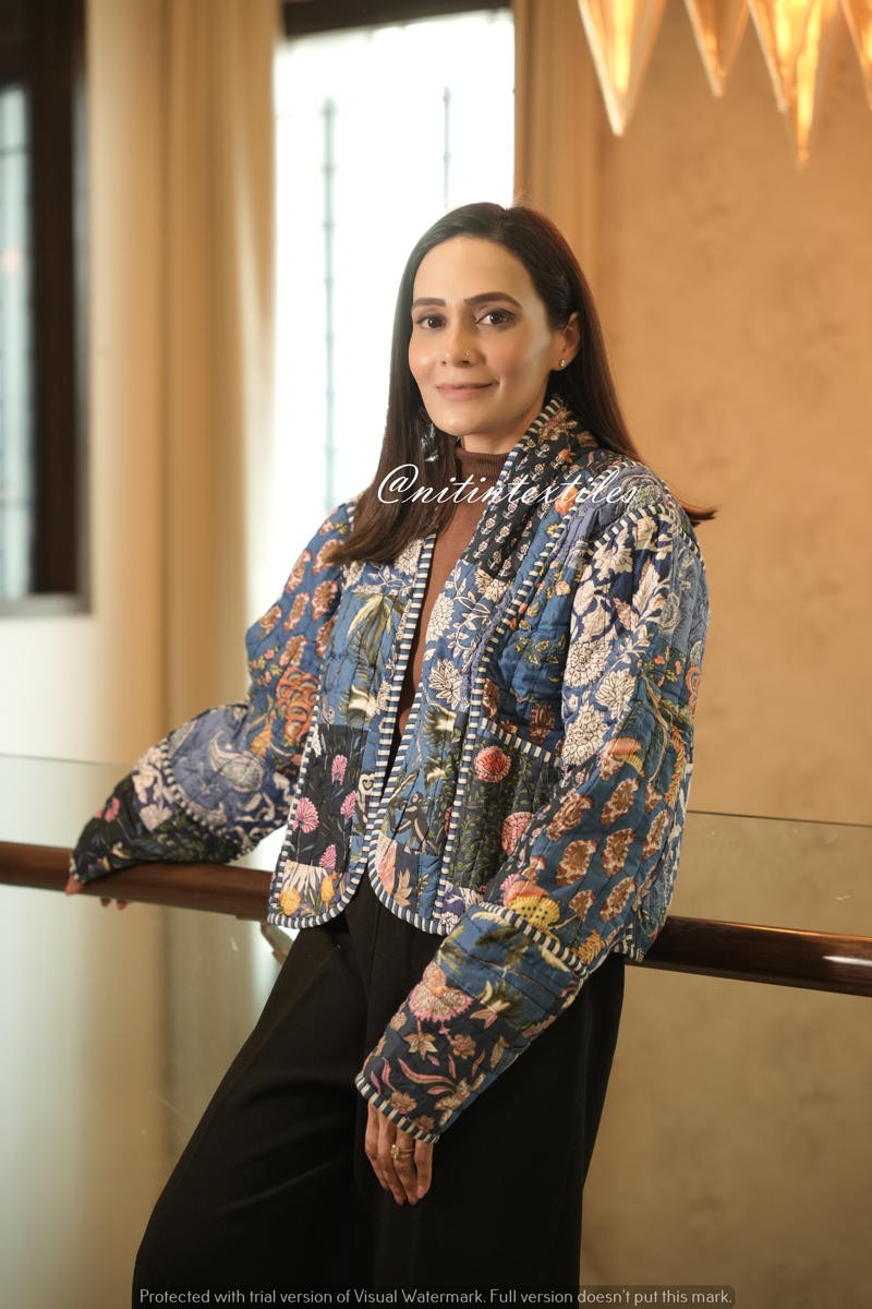 Wrap yourself in elegance with this stunning royal blue quilted jacket from Nitin Textiles. Handcrafted with intricate floral patterns in vibrant pinks and oranges, this full-sleeve waistcoat-style jacket is the perfect blend of comfort and statement-making design. The detailed contrast piping and front patch pockets add a touch of traditional charm, making it ideal for festive layering or a stylish casual look.