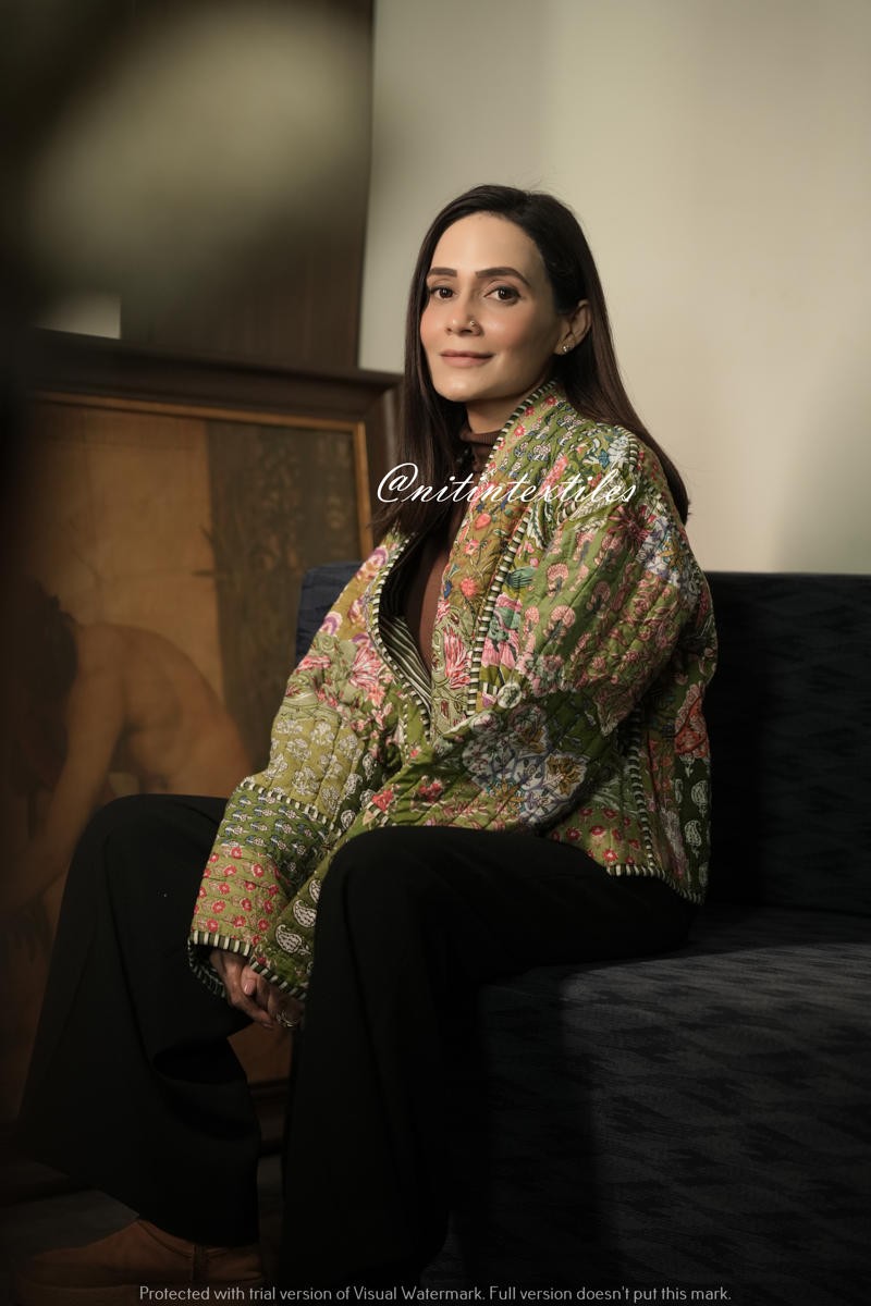 Handmade Cotton Patchwork Green Quilted Open Front Jacket