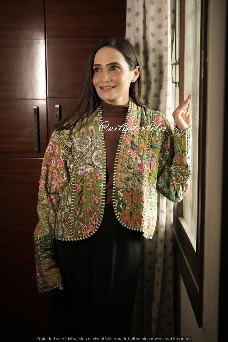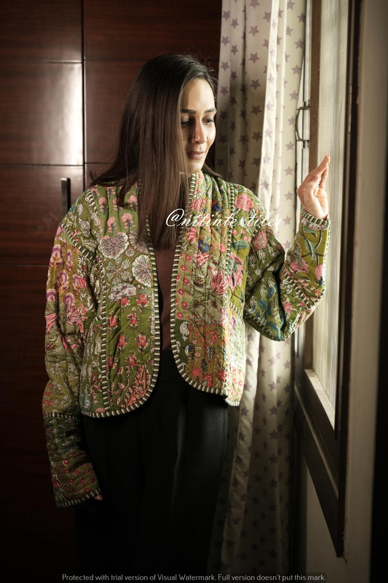 Home Jackets Handmade Cotton Patchwork Green Quilted Open Front Jacket