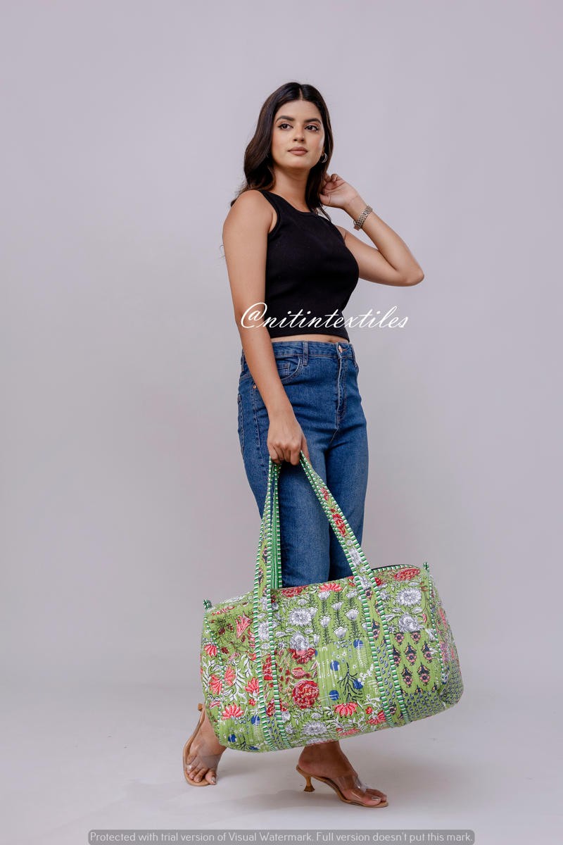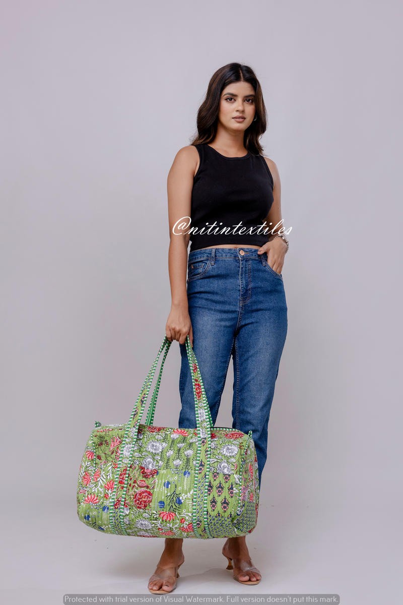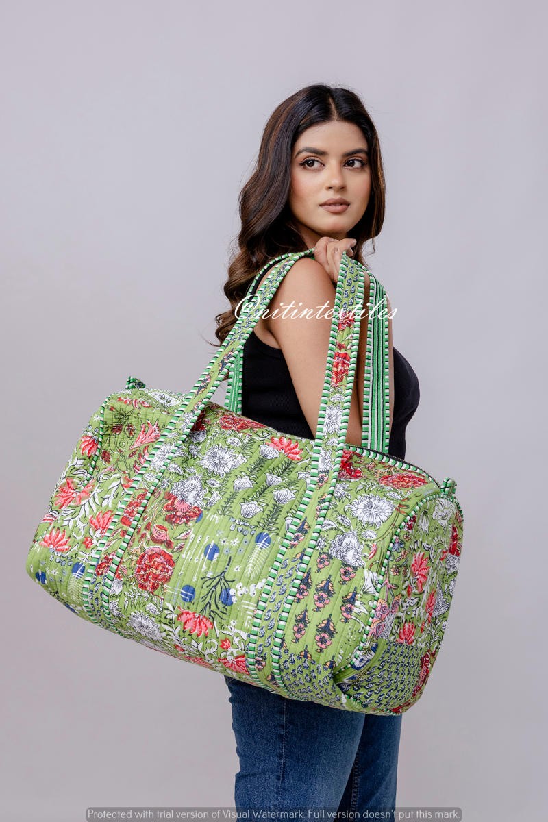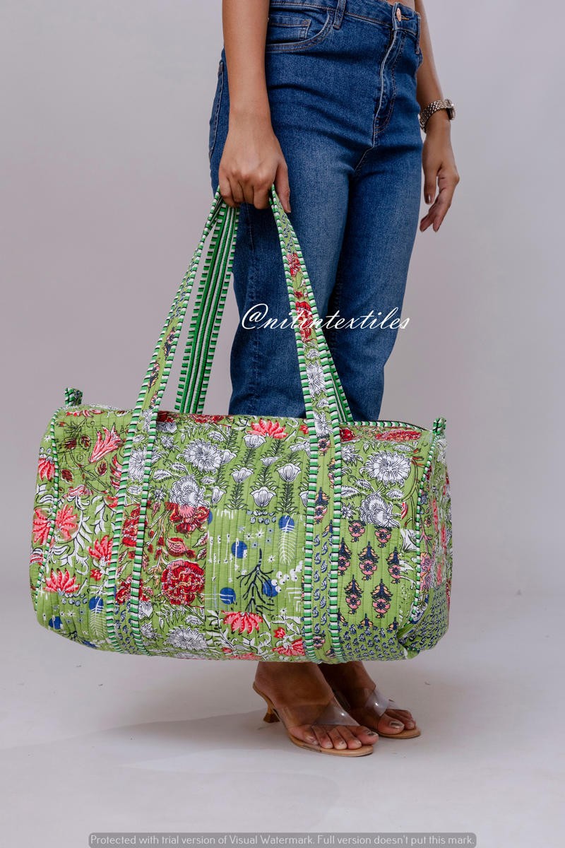 Home Duffle Bags Handmade Cotton Green Patchwork Quilted Free Size Duffle Bag with Zipper Closer ( Perfect Travel Partner )