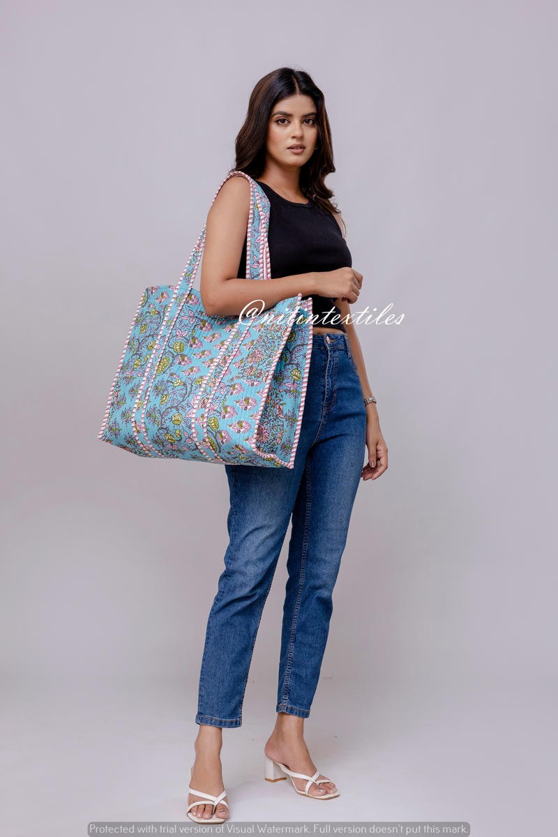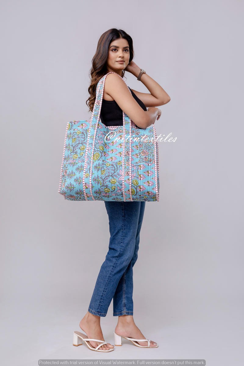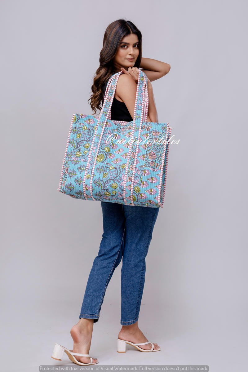 Sky Blue Patchwork Printed Reversible Quilted Tote Bag Your Perfect Beach Holiday Partner