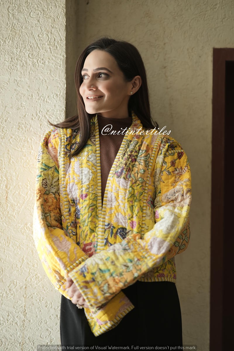 Yellow Quilted Floral Patchwork Jacket – Handcrafted Elegance